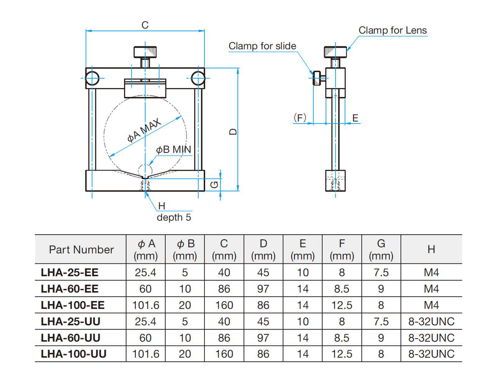 | 注意 | ▶在滑动部分的锁紧机构没有牢固锁紧时,转动透镜压紧机构的话,无法固定透镜。 ▶透镜的外径变化时,其光轴高度也变化。请选用合适的底板(立柱)等,调整光轴高度。 |