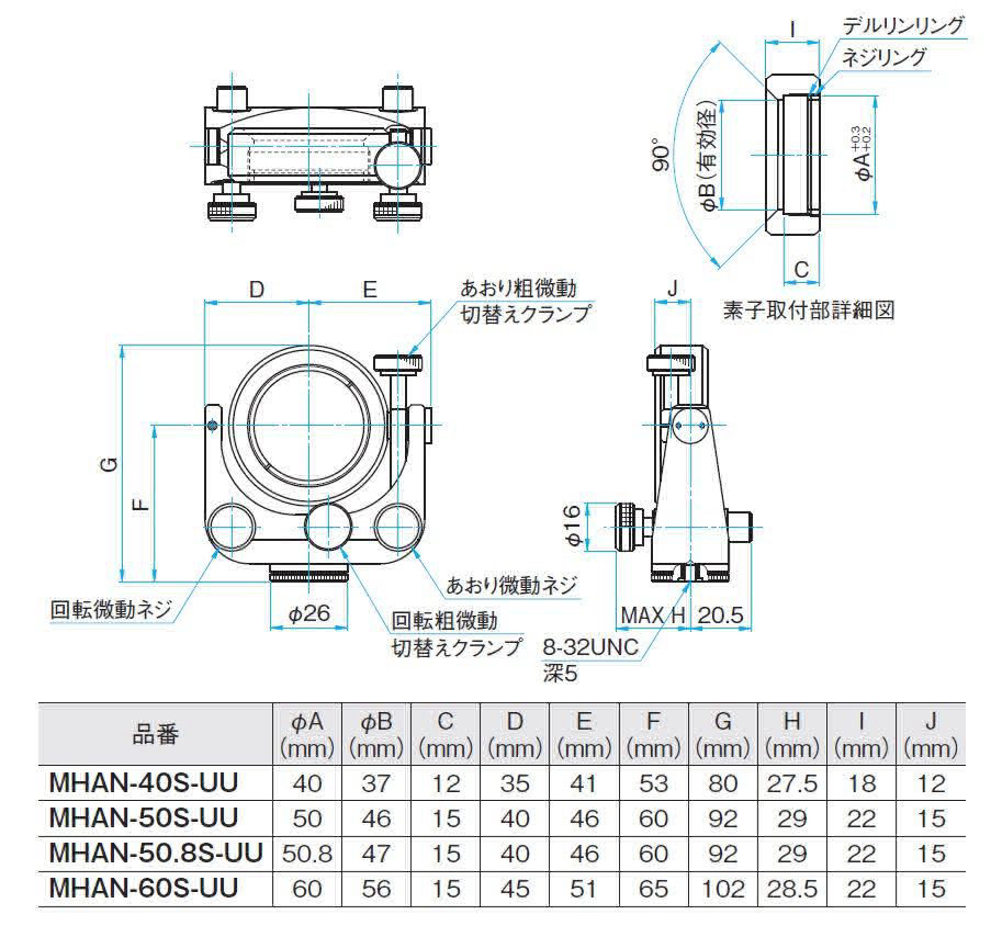 | 信息 | ▶此镜架附属的立柱为RO-20-60(φ20mm长60mm),但也可根据客户要求更换其他的尺寸。装卸立柱时一般需要用台钳或钳子等工具的。但在购买镜架时客户可指定立柱的长度。但如果更改前后的立柱长度相差太大的话,也会收取一定的差额费用的,详情请咨询。 ▶我们还提供低光轴用高稳定性的2维可调反射镜镜架(MHG-NL)。 WEB参照/カタログコードW4508 |