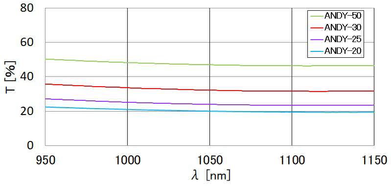 | 注意 | ▶不可用于高能量激光,否则滤光片会有损坏的危险。高能量激光请使用反射型中性滤光片(FDN)。 ▶优先透过率的特性,通过改变滤光片厚度调节实际的透过率性能。因此,每个滤光片厚度都不一样。需要保持(5mm以下)厚度一致时,请使用带框的滤光片(MAN/MANY)。 ▶透过率的波长特性随制造批号的不同而不同。尤其是适用波长之外的波长特性变化随制造批号的不同变化较大。如果使用波长超出指定波长范围时,请使用反射型滤光片(FND)。 ▶由于中性滤光片未蒸镀防反射膜,会产生4%左右的反射。 |