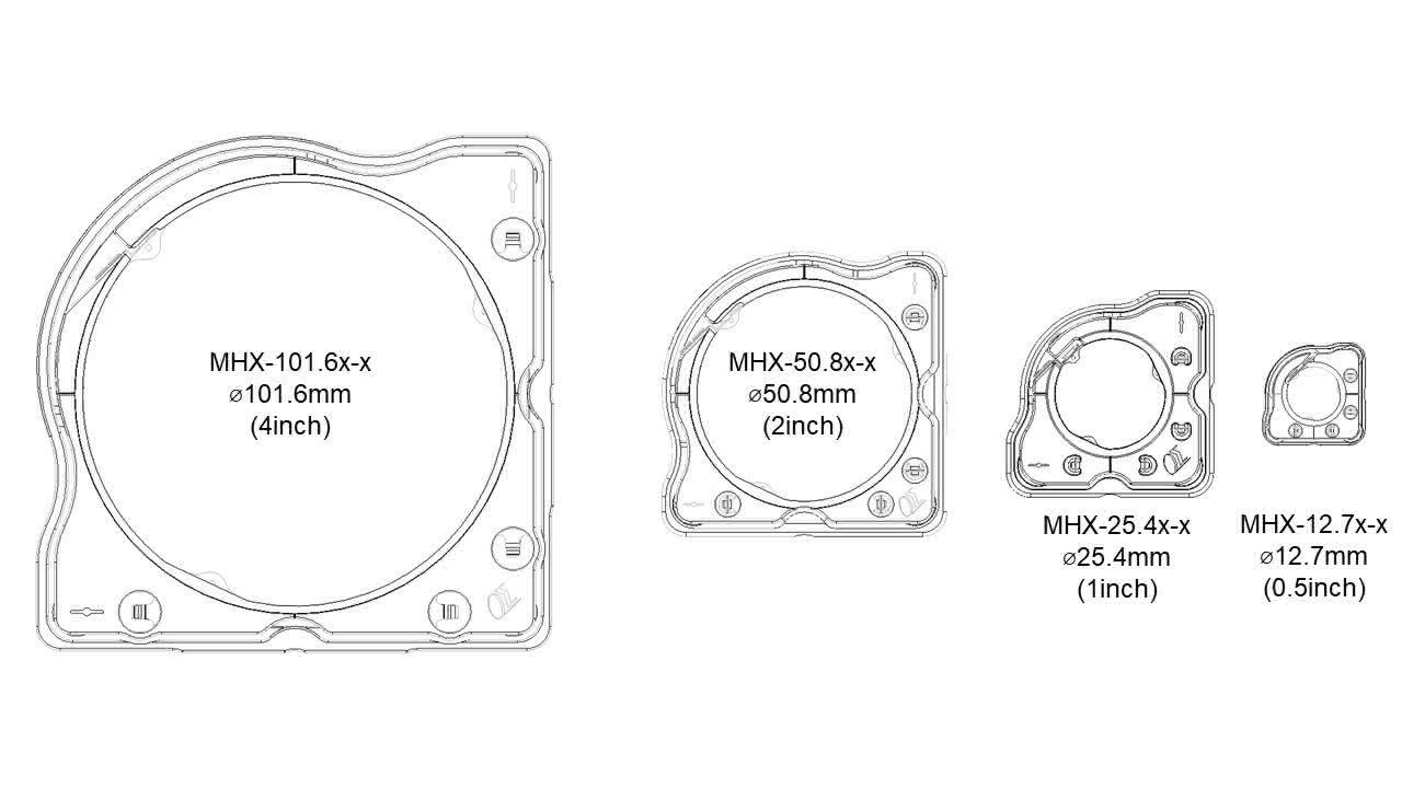 | 注意 | - MHX-25.4/50.8不能连接M6螺纹的立柱(RO)。如希望使用立柱的话,请使用M4,或8-32 UNC螺纹规格的立柱(ROC,RO-UU)。MHX-12.7无法连接头部是螺纹的立柱。MHX系列都可以用M4或8-32UNC螺钉固定于带有相应螺纹孔的立柱或转换板上。(MHX-12.7的话,请使用附属的小头螺钉。)
