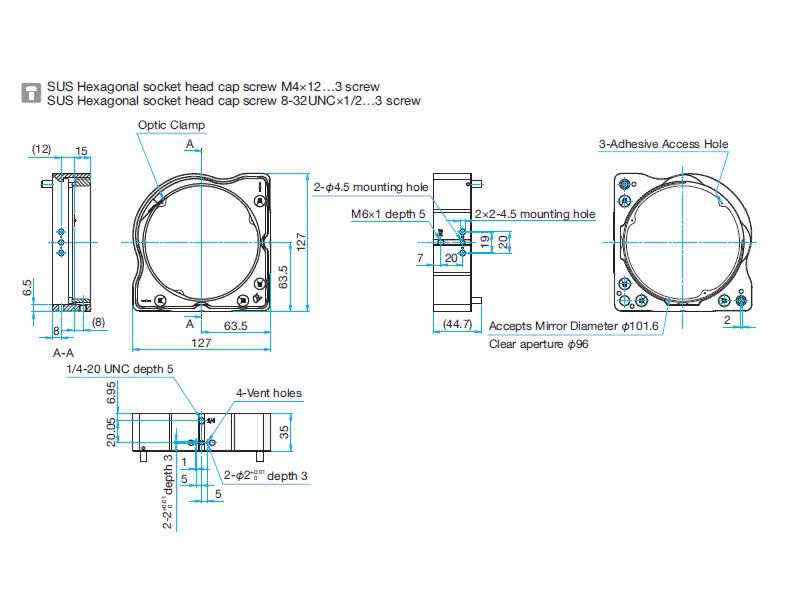 - 反射镜从镜架侧面3点固定,其中包含使用紧定螺钉调节片弹簧压力以进行锁紧的固定点。