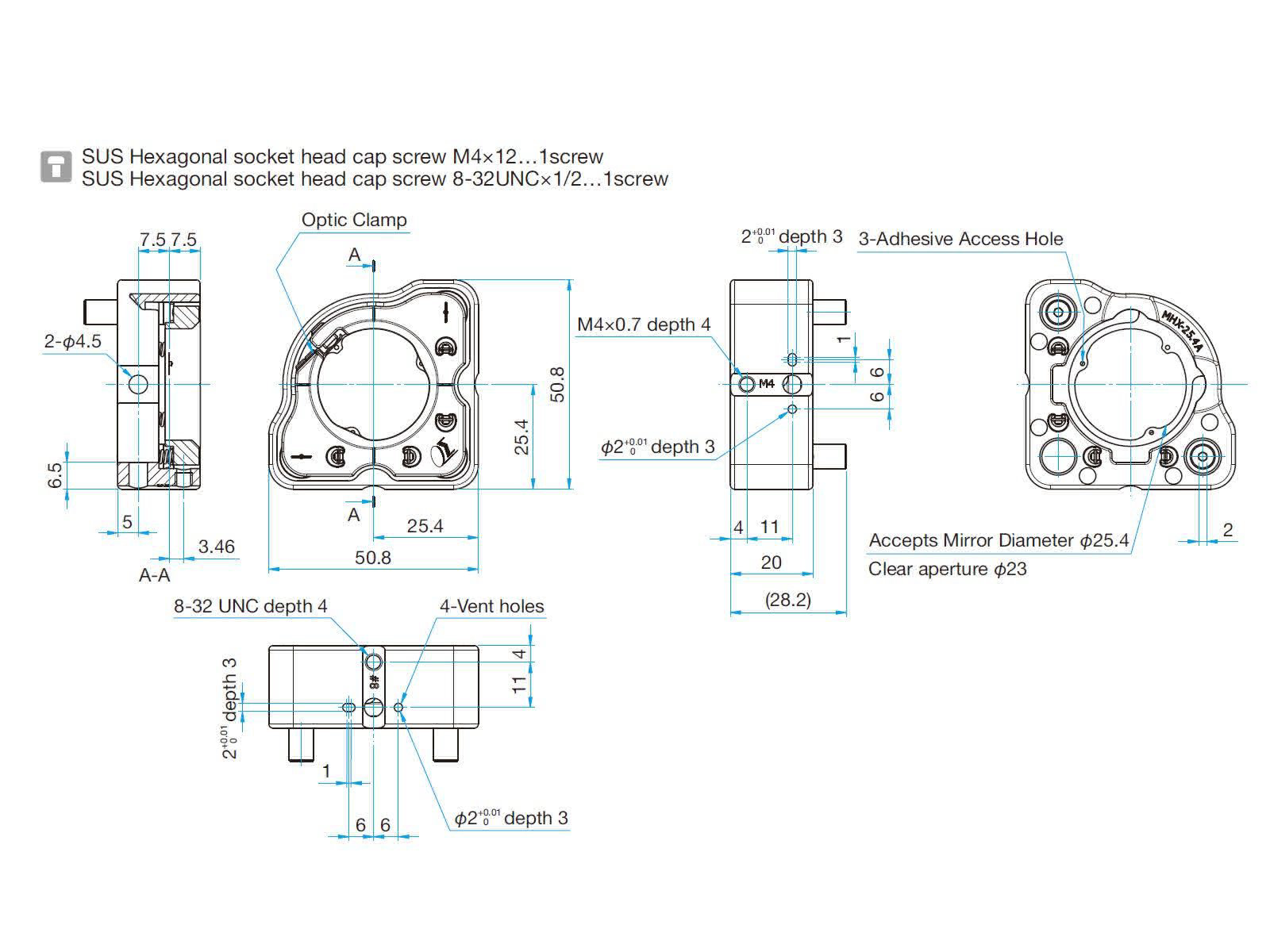 | 注意 | - MHX-25.4/50.8不能连接M6螺纹的立柱(RO)。如希望使用立柱的话,请使用M4,或8-32 UNC螺纹规格的立柱(ROC,RO-UU)。MHX-12.7无法连接头部是螺纹的立柱。MHX系列都可以用M4或8-32UNC螺钉固定于带有相应螺纹孔的立柱或转换板上。(MHX-12.7的话,请使用附属的小头螺钉。)