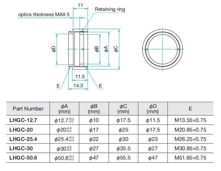 | 信息 | ▶不附带树脂垫圈。如果需要树脂垫圈的话,请另外选购。 WEB参照/カタログコードW4017 ▶可配合小型可调芯镜架(LHCM) WEB参照/カタログコードW4512,3轴或5轴可调镜架(ALHN) EB参照/カタログコードW4016使用,方便调芯。 ▶我们也备有专门的滤光片镜架(FHS/FH)。 WEB参照/カタログコードW4043 |