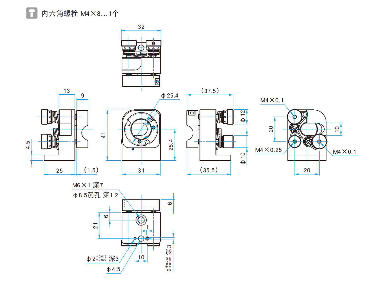 - 除了俯仰和倾斜调整轴,支点轴也采用了调整螺钉,可用于改变光路长度。