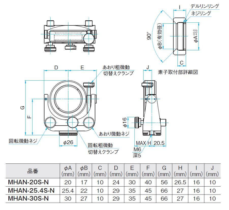 | 信息 | ▶此镜架附属的立柱为RO-20-60(φ20mm长60mm),但也可根据客户要求更换其他的尺寸。装卸立柱时一般需要用台钳或钳子等工具的。但在购买镜架时客户可指定立柱的长度。但如果更改前后的立柱长度相差太大的话,也会收取一定的差额费用的,详情请咨询。 ▶我们还提供低光轴用高稳定性的2维可调反射镜镜架(MHG-NL)。 WEB参照/カタログコードW4508 |