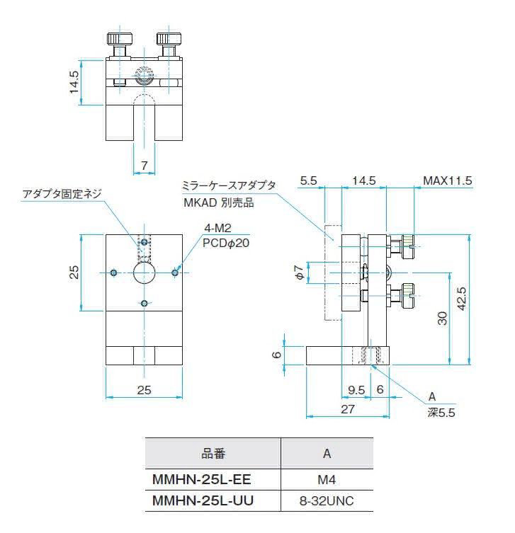 ◦镜架的固定孔位置有2种,在反射镜侧的是MMHN-25L型,在调整旋钮侧的是MMHN-25R型。可选择不同类型,避免配置时的干涉。
