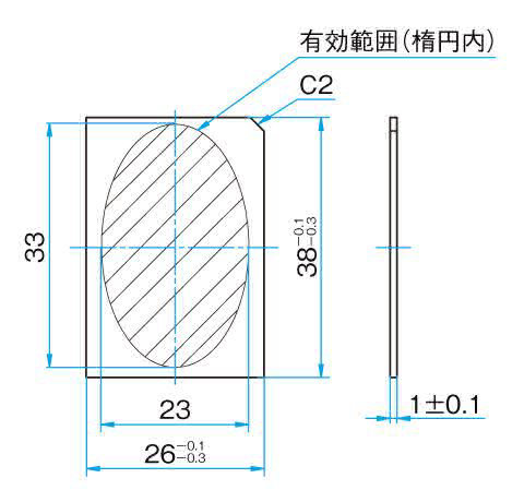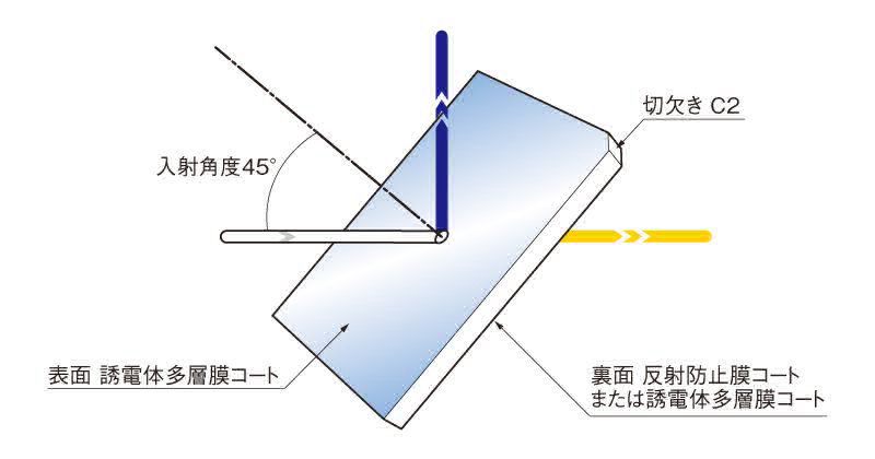 | 注意 | ▶滤光片的透过率波长特性是正反两面镀膜的合成特性。 ▶在45°入射角度之外使用时,透过·反射率的特性有时会产生变化。 ▶观看正面,缺口在右上角时的前面为入射面。 |