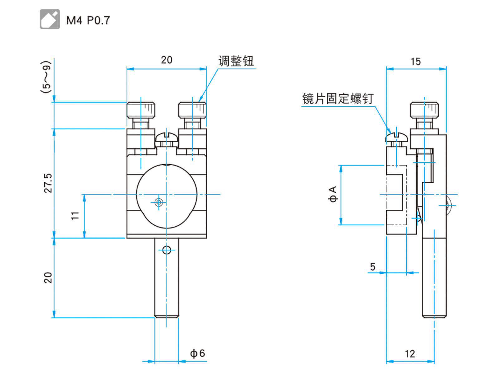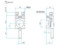 | 技术指标 | | 主要材料 | 铝合金 | | 表面处理 | 黑色氧化 | | 适用元器件外径 φA | φ10 mm | | 适用元器件厚度 | 5 mm | | 调整范围俯仰 | ±2.5° | | 调整范围方位 | ±2.5° | | 分辨率俯仰 | 约0.28°/周 | | 分辨率方位 | 约0.3°/周 | | 自重 | 约0.03 kg |